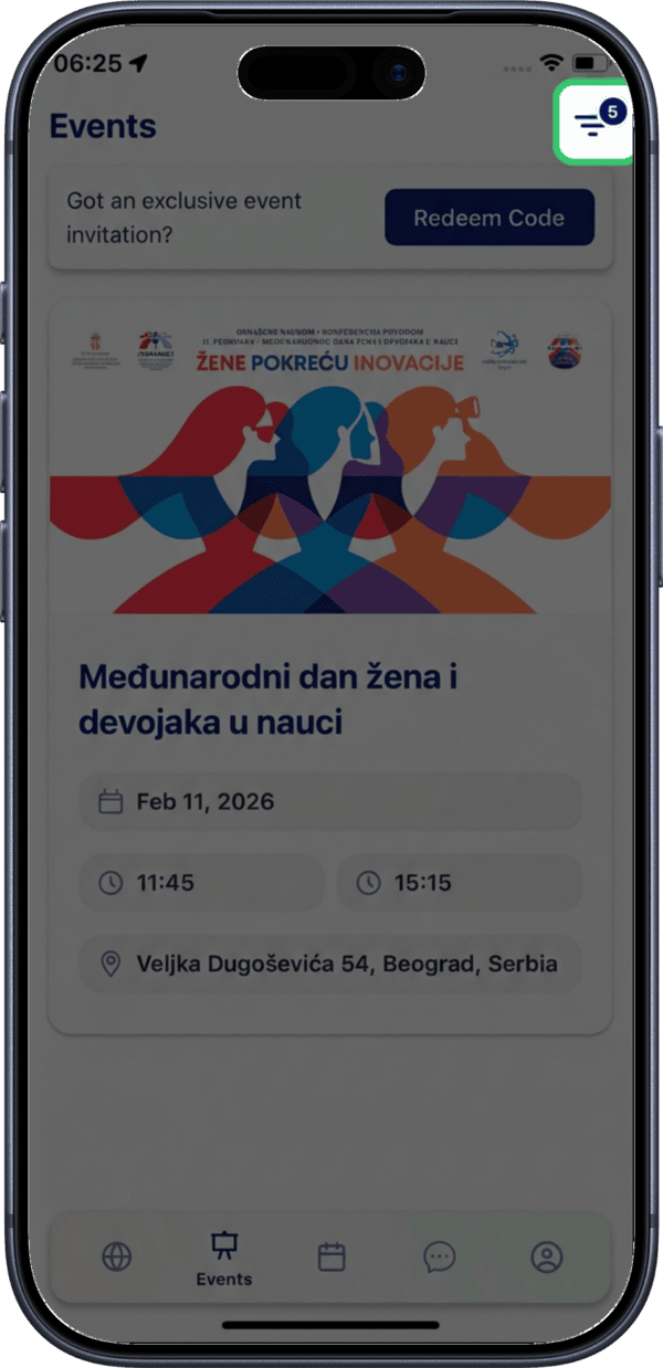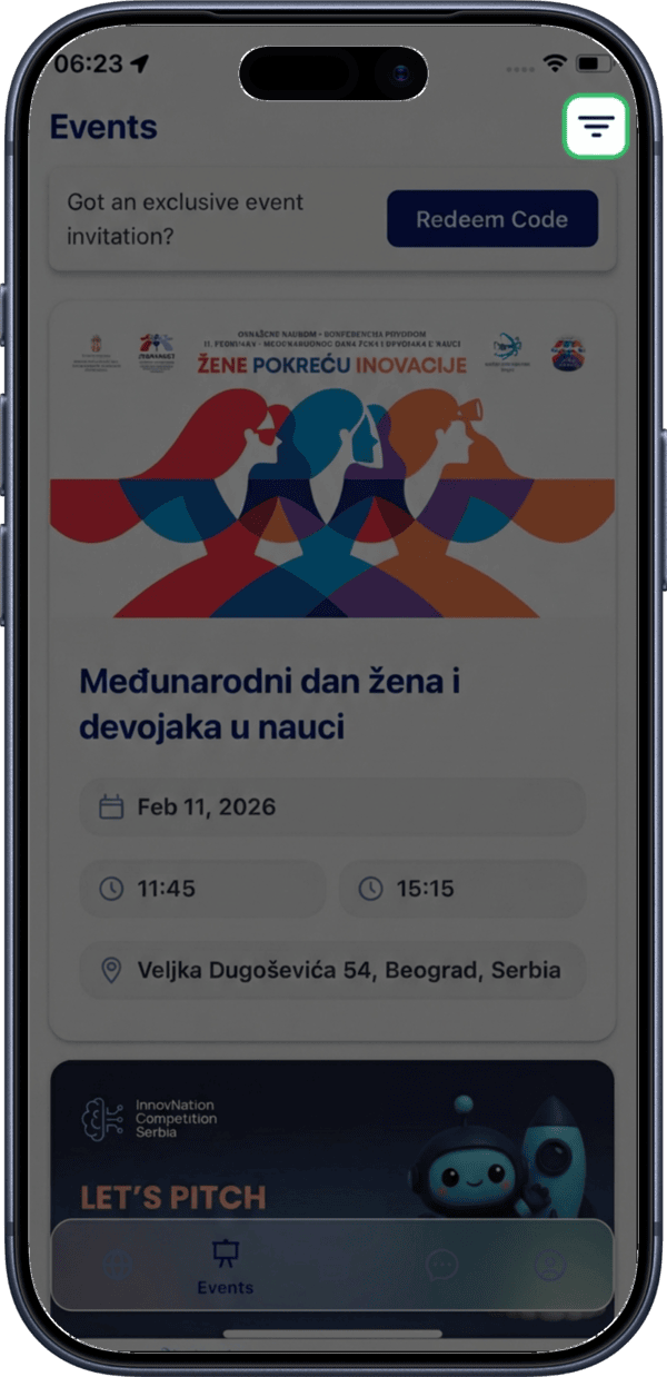 Tap the filter icon in the top right corner of the events screen to access the available filters.