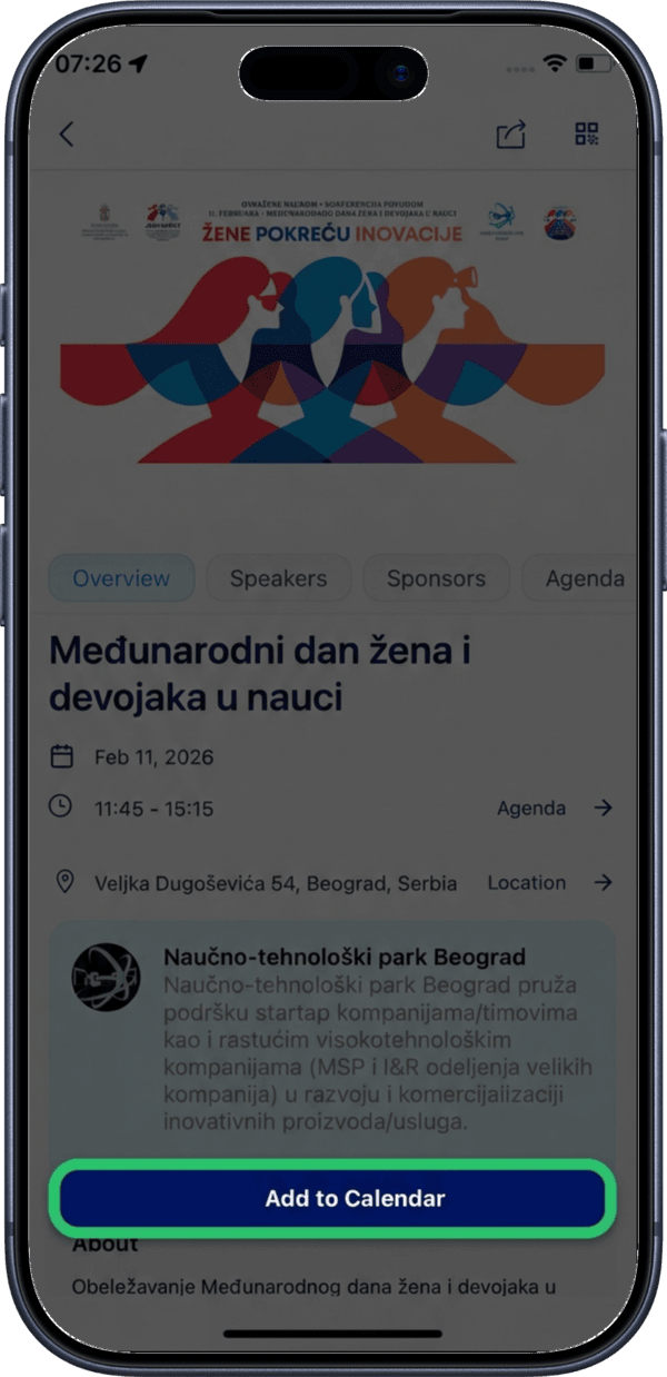 Tap the Add to Calendar button to sync the event to your connected calendar (Google or Microsoft). If you haven't connected a calendar yet, you will be prompted to do so.