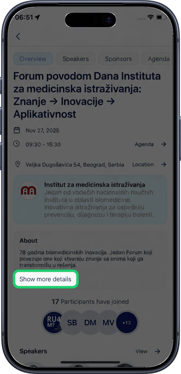 Tap Show more details to expand the event description and see additional information about the event.