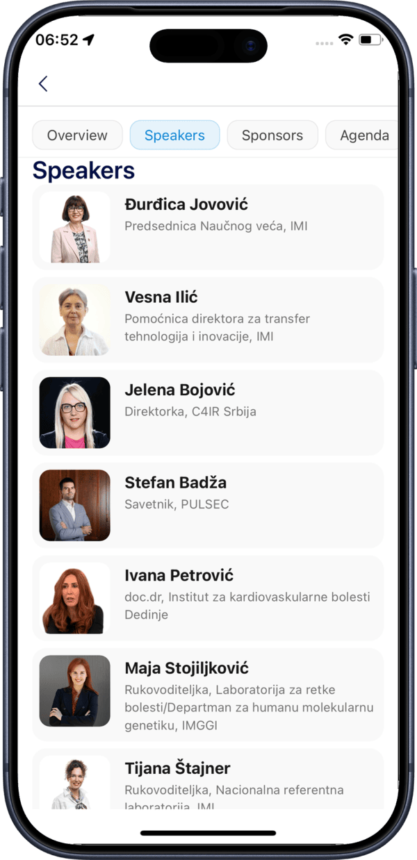The Speakers tab lists all speakers presenting at the event with their name, photo, and title.
