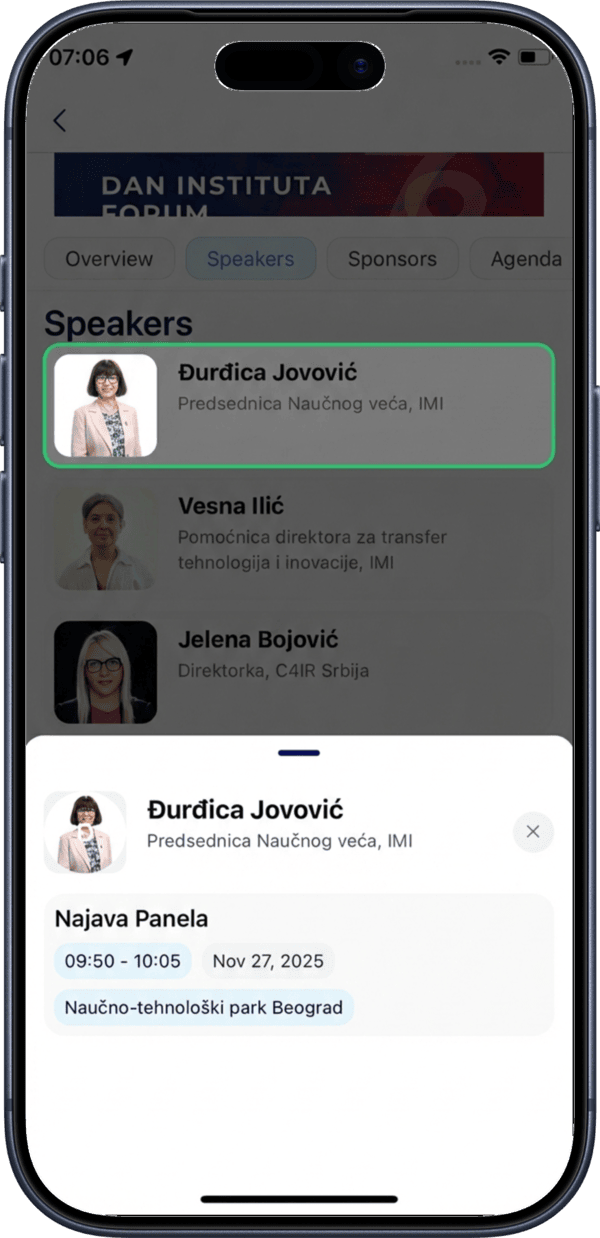Tap on any speaker to see a modal with the list of sessions they are participating in.
