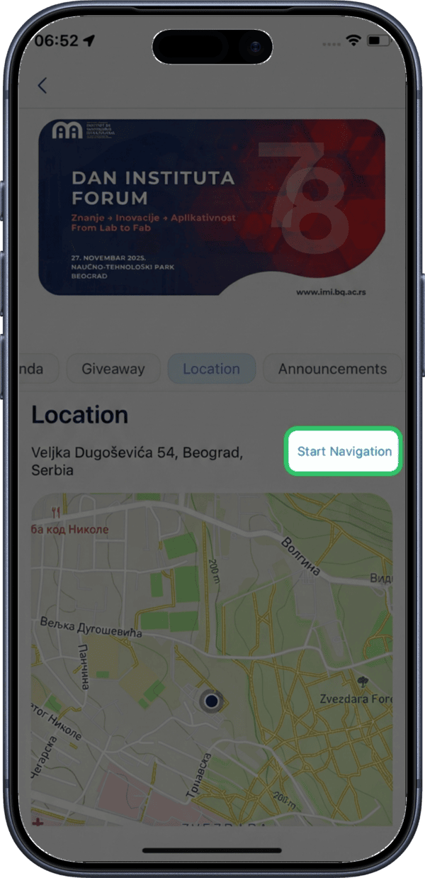 Tap Start Navigation to open Google Maps with directions to the event venue.