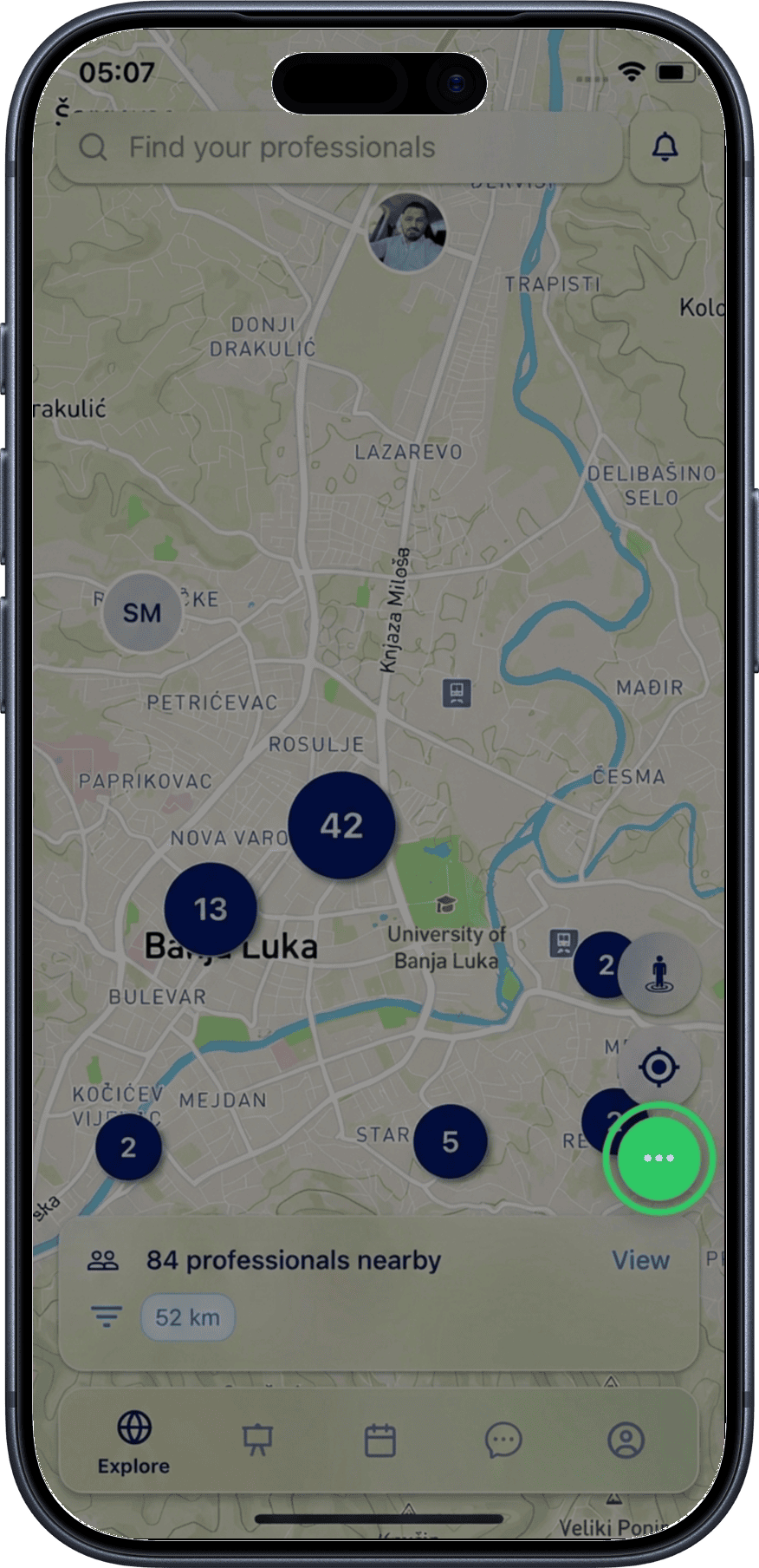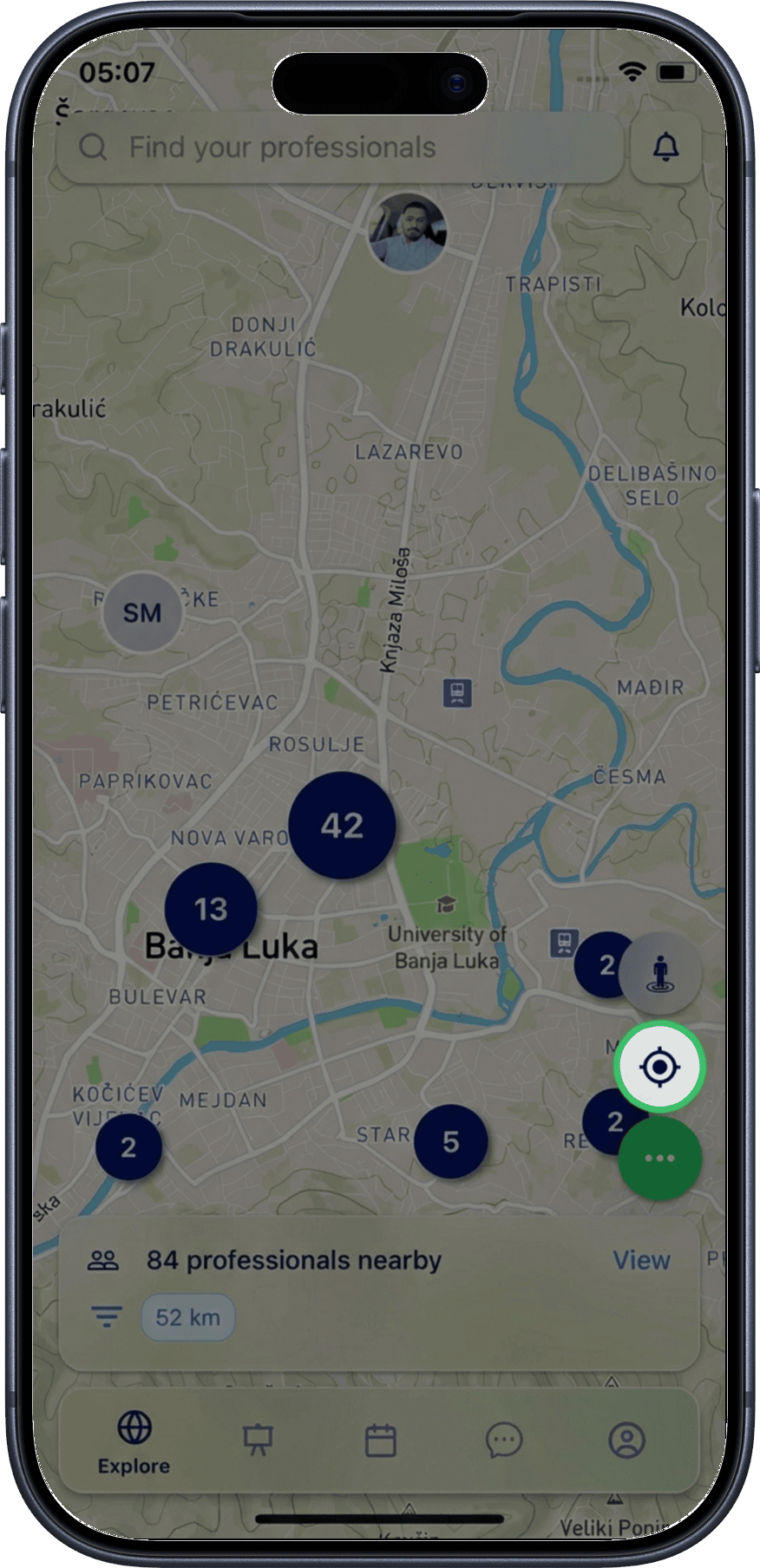 - Professionals Nearby — browse and filter professionals within 100 km
