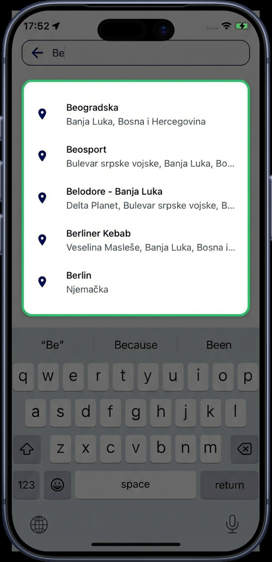 Start typing — after just two characters, results appear sorted by proximity to your current position, with the closest locations listed first.