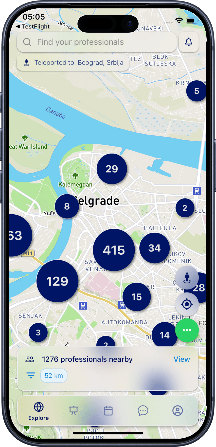 Tap a result to teleport. The Explore page automatically refreshes and navigates to the selected location. All map data (nearby professionals, clusters) adapts to the new position.