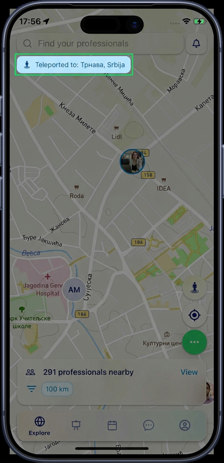 Teleport lets you virtually explore professionals in any location worldwide without physically being there. It is the first of three buttons on the right side of the Explore screen.