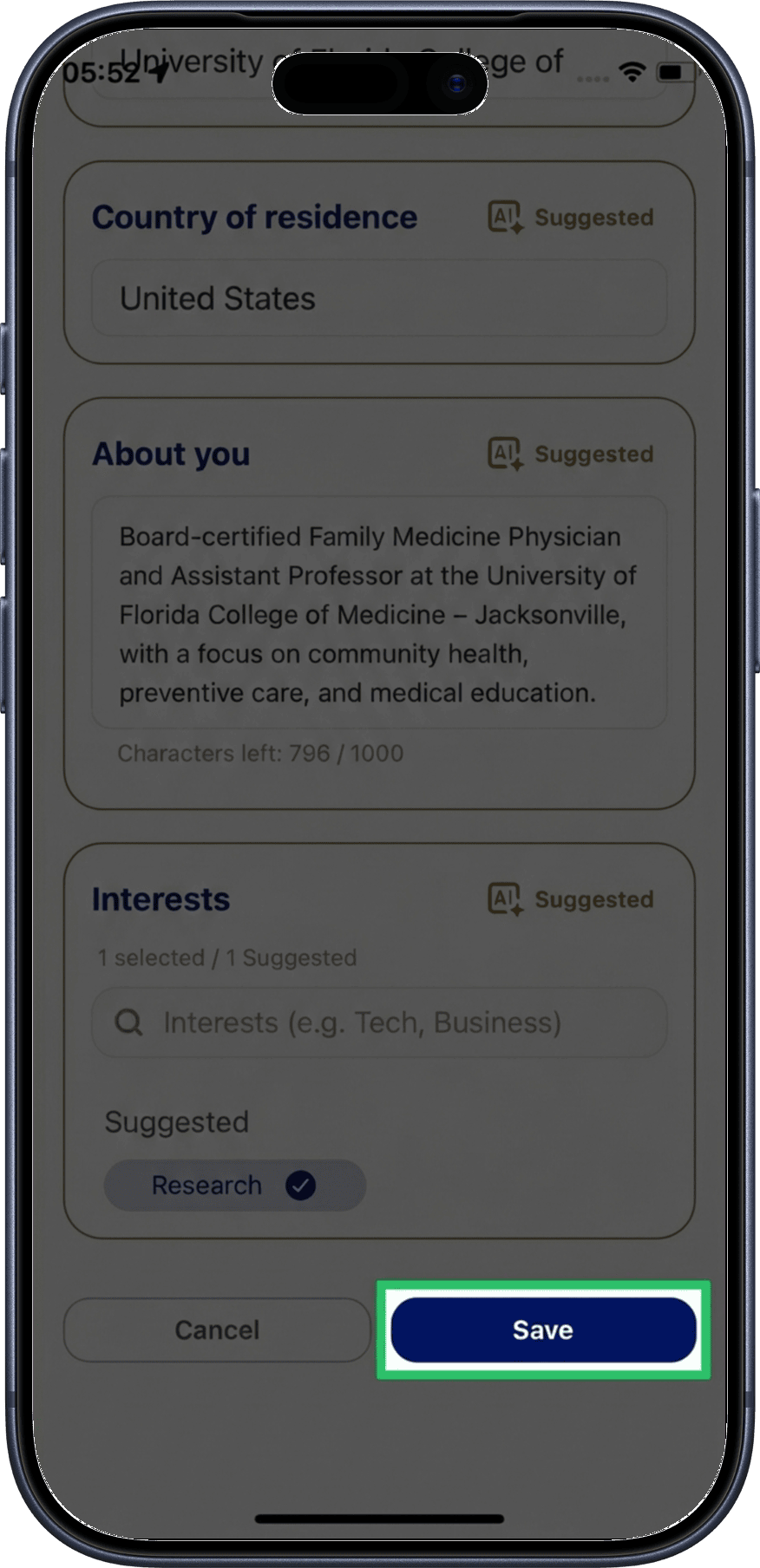 If you're happy with the AI-generated content, tap Save to apply the suggestion to your profile.
