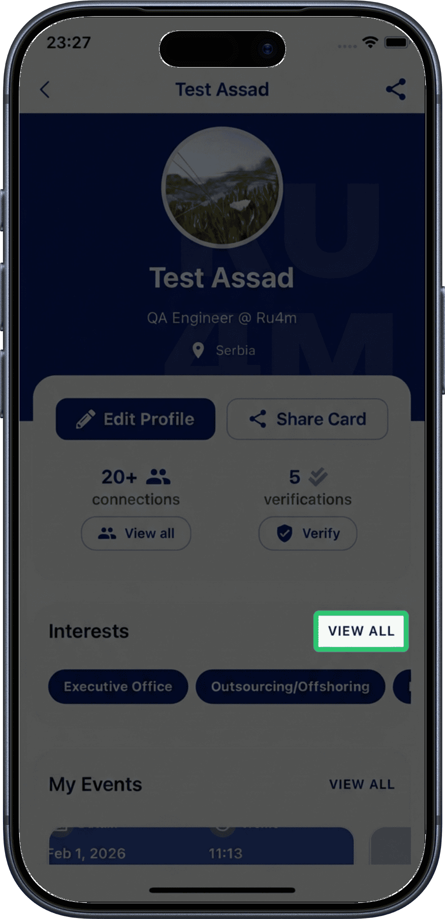 From your profile screen, scroll to the interests section and tap View All to see all available interests.
